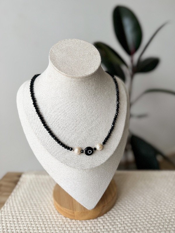 Moderno y con un toque místico, este collar estilo gargantilla de cristales de roca negro combina un dije de ojo turco de vidrio con perlas de río, creando un diseño único lleno de personalidad. Su mezcla de texturas y materiales aporta sofisticación y un aire boho chic, convirtiéndolo en un accesorio versátil para realzar cualquier look, ya sea de día o de noche. Perfecto para sumar protección, estilo y distinción a tus outfits.