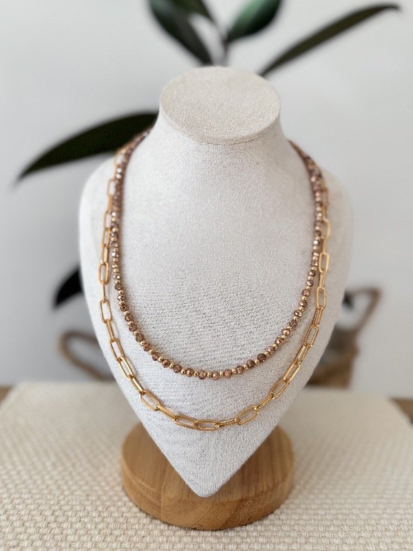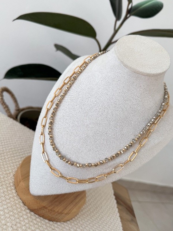 Collar tipo gargantilla que fusiona dos estilos en una sola pieza: una cadena simple y una sutil tira decorada con delicados cristalitos de roca. El equilibrio perfecto entre lo minimalista y lo sofisticado. Ideal para lucir con camisas abiertas o prendas escotadas, realza el cuello con un brillo discreto y moderno. Liviano, versátil y atemporal, es el accesorio perfecto para acompañarte todos los días, sumando un toque de elegancia sin esfuerzo.