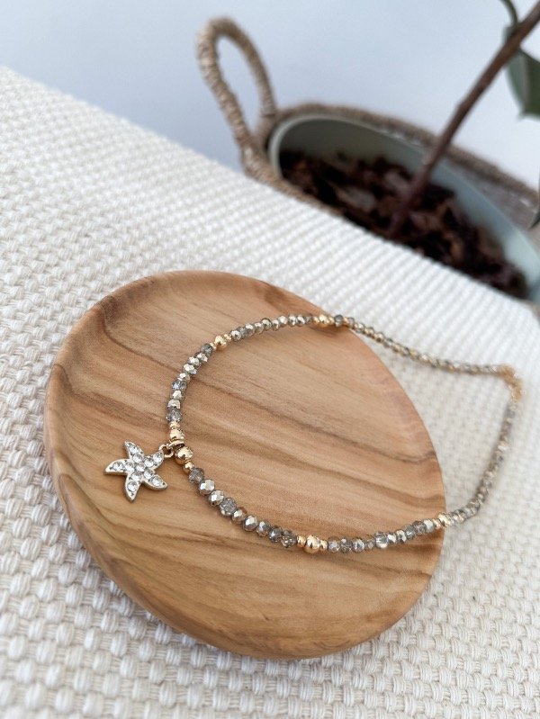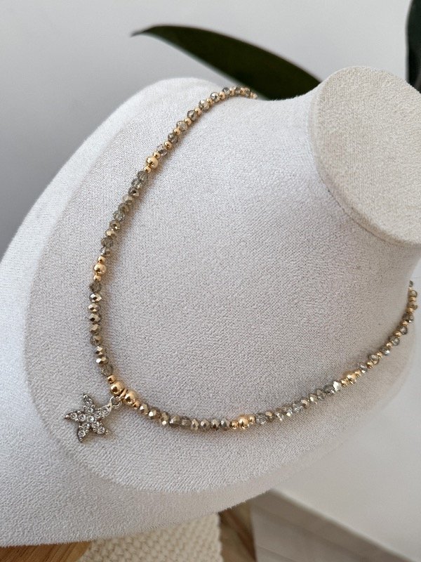 Collar tipo gargantilla confeccionado con delicados cristalitos de roca y un encantador dije en forma de estrella de mar. Su diseño sutil y luminoso lo convierte en la pieza perfecta para realzar camisas abiertas o prendas escotadas, aportando un toque de elegancia y feminidad. Ideal para lucir solo o combinado con otros collares, creando capas con estilo y personalidad. Un accesorio versátil que suma luz y encanto a cualquier look, tanto de día como de noche.