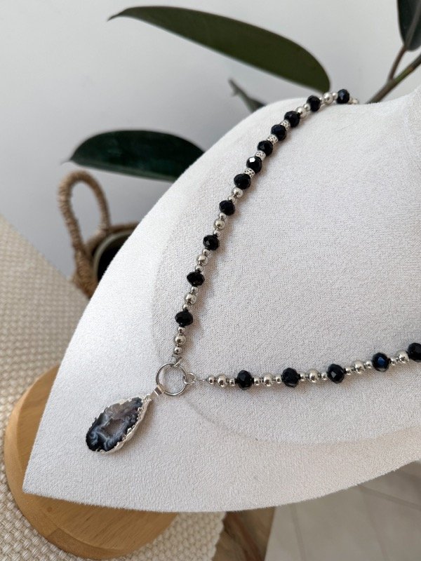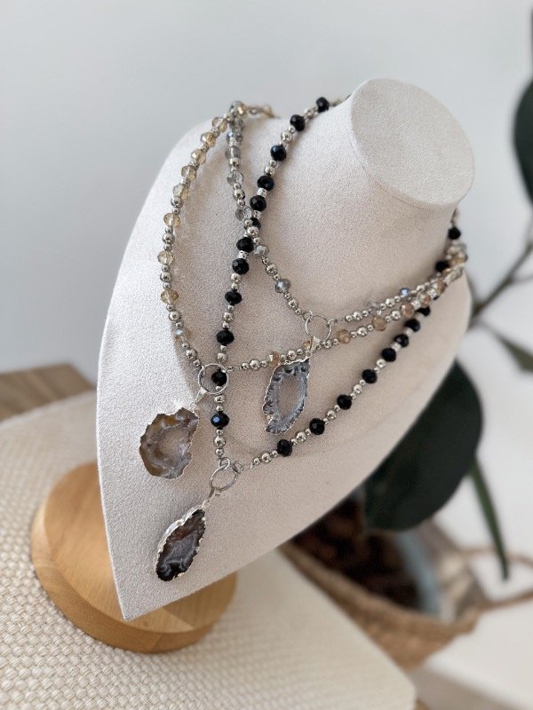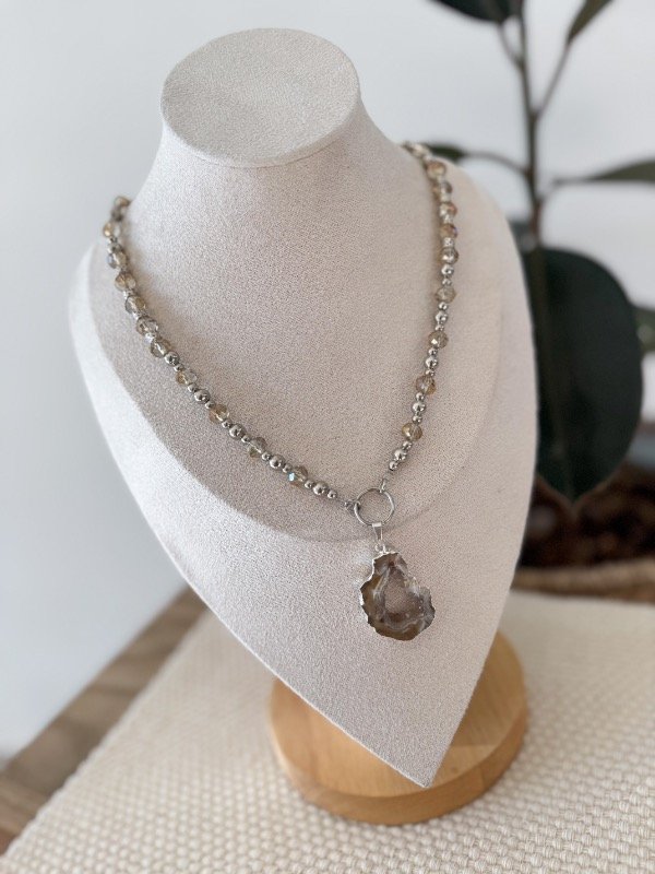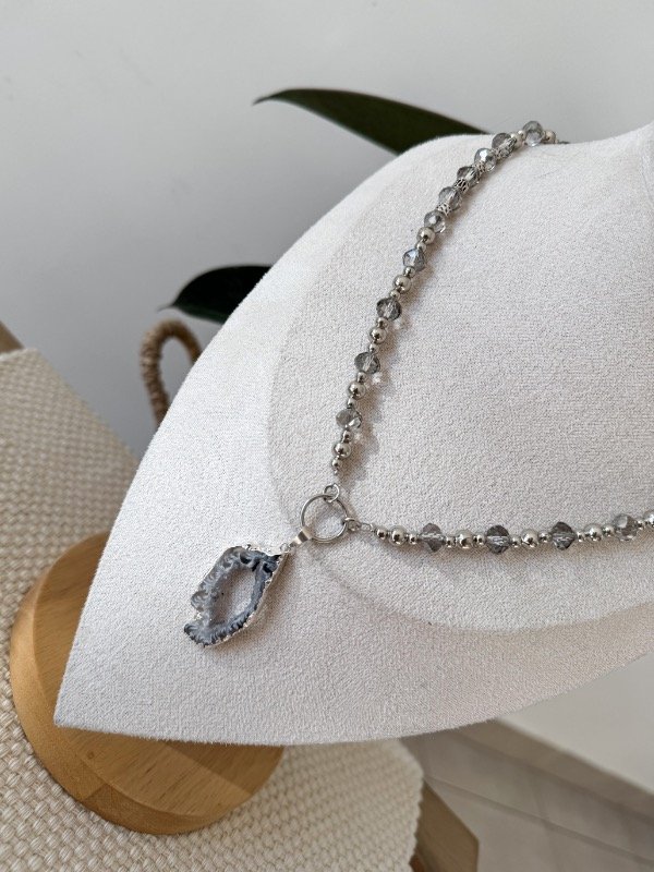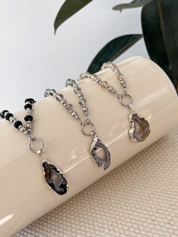 Collar de cristalitos de roca con piedra natural geoda engarzada, una pieza única y poderosa que destaca por su impacto visual. La geoda, con sus cristales naturales, aporta un toque de energía y sofisticación, mientras que la cadena gruesa le da carácter y presencia. Perfecto para quienes buscan un accesorio que combine fuerza, belleza y estilo en un solo complemento. Ideal para realzar cualquier look con un toque de distinción.