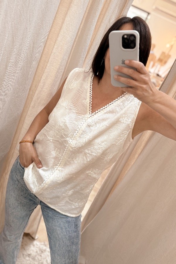 Blusa sin mangas con escote en V en el frente, confeccionada en tela fresca y liviana que brinda comodidad y soltura. Está delicadamente combinada con bordados en tonos natural, aportando un estilo femenino y boho. Perfecta para looks veraniegos o para sumar un toque delicado y original a tu outfit diario.