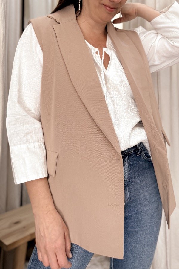 Chaleco confeccionado en tela sastrera con forrería interna, que aporta estructura y una terminación prolija. Posee bolsillos laterales funcionales y un corte clásico que se adapta a distintos estilos. Ideal para sumar un toque canchero y sofisticado a tus looks. Combinalo con shorts mom de jean y texanas o botitas para un outfit con personalidad y aire urbano-boho. Una prenda versátil que eleva cualquier conjunto.