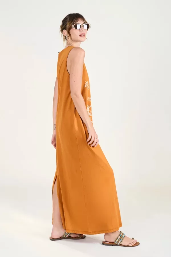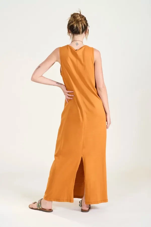 Vestido largo sin mangas, confeccionado en algodón suave y liviano que brinda comodidad y frescura. De corte recto contajo en la parte trasera, ofrece libertad de movimiento y una silueta relajada.