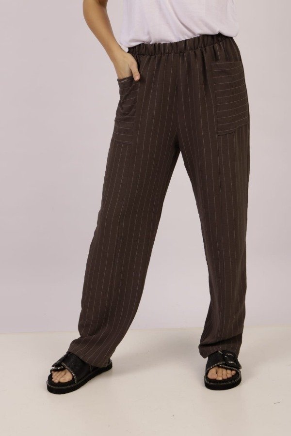 Este pantalón es la combinación perfecta entre estilo y comodidad. Confeccionado en una tela súper fresca y liviana, presenta un diseño en tonos neutros con leves rayitas que lo hacen fácil de combinar. Su calce relajado se complementa con un elástico en todo el contorno de la cintura, ideal para acompañarte en los días de más movimiento. Los bolsillos delanteros cuadrados le aportan un toque canchero y urbano. Un infaltable para esta temporada, cómodo, versátil y con mucha onda.