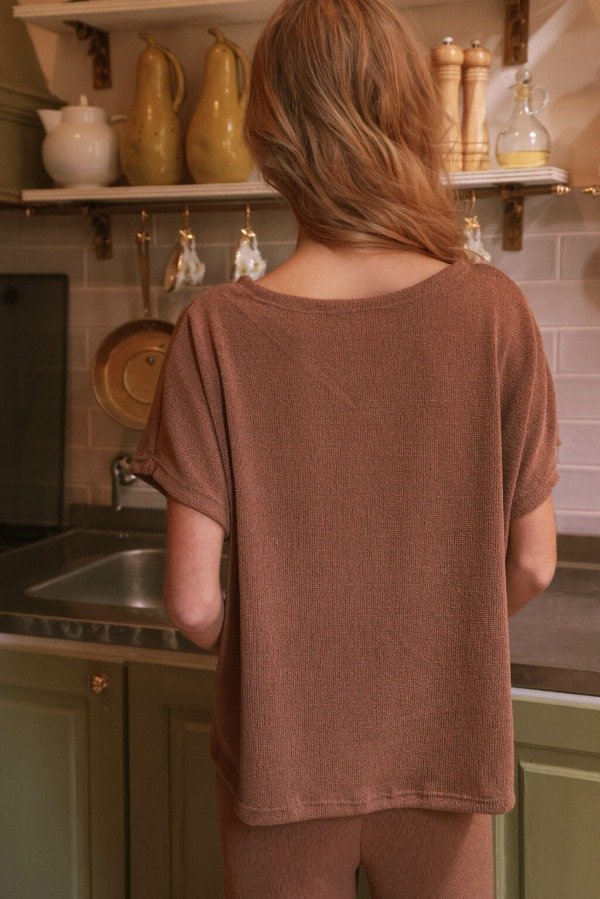 Remera de punto confeccionada en tejido fino, con una silueta relajada y holgada que garantiza comodidad sin sacrificar estilo. Ideal para un look casual, esta prenda se distingue por su textura ligeramente granulada, que aporta un detalle visual sutil y una sensación de suavidad al contacto con la piel. Perfecta para combinar con jeans, pantalones amplios o faldas informales, es una opción versátil para el día a día.